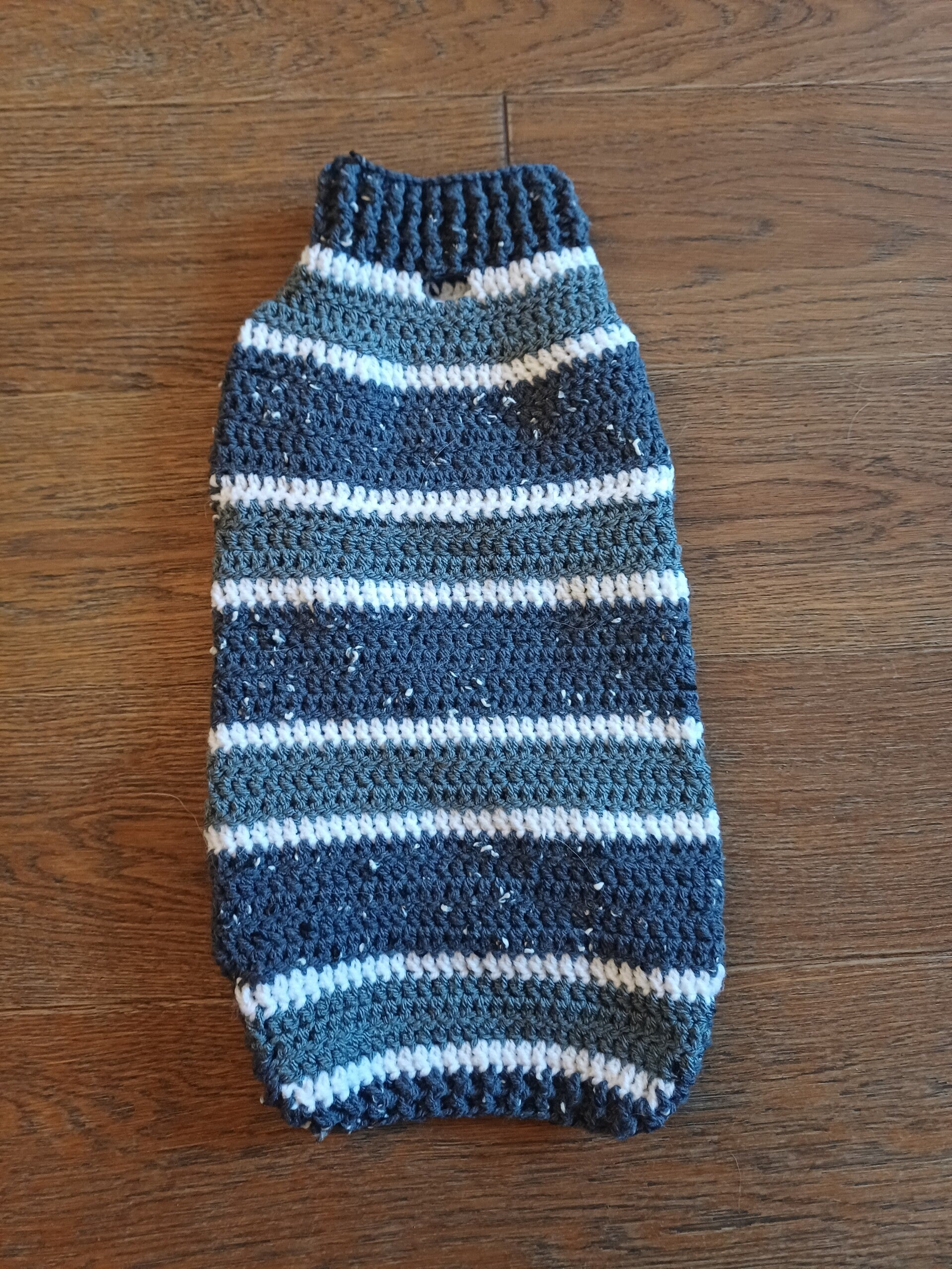 I have used two shades of blue and white for this jumper. One of the blues is tweed and has white specs running throughout. The other blue is dk wool and the white is aran wool.